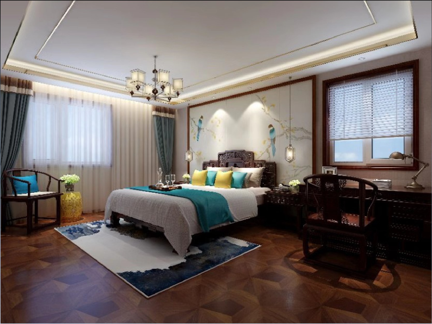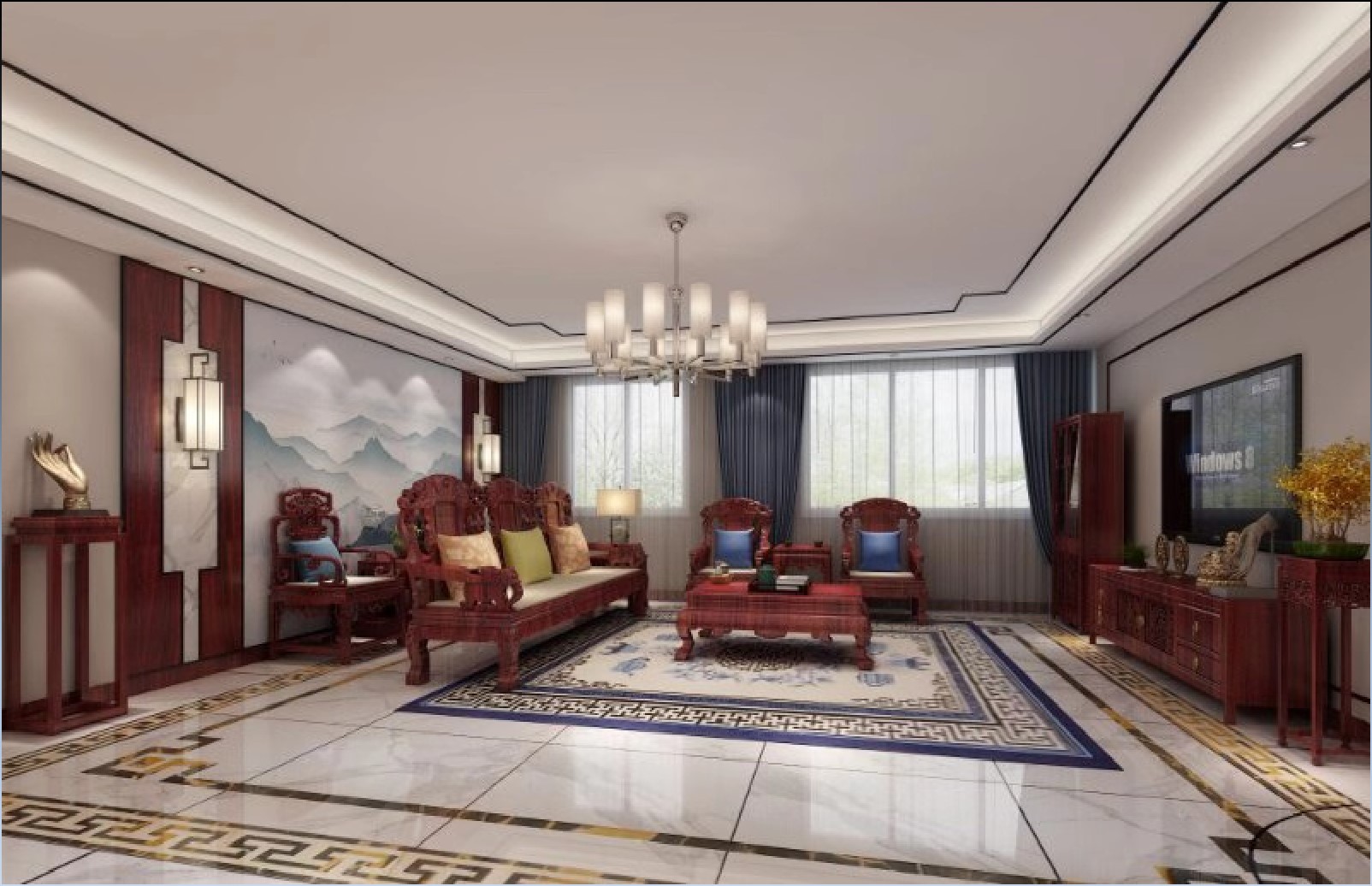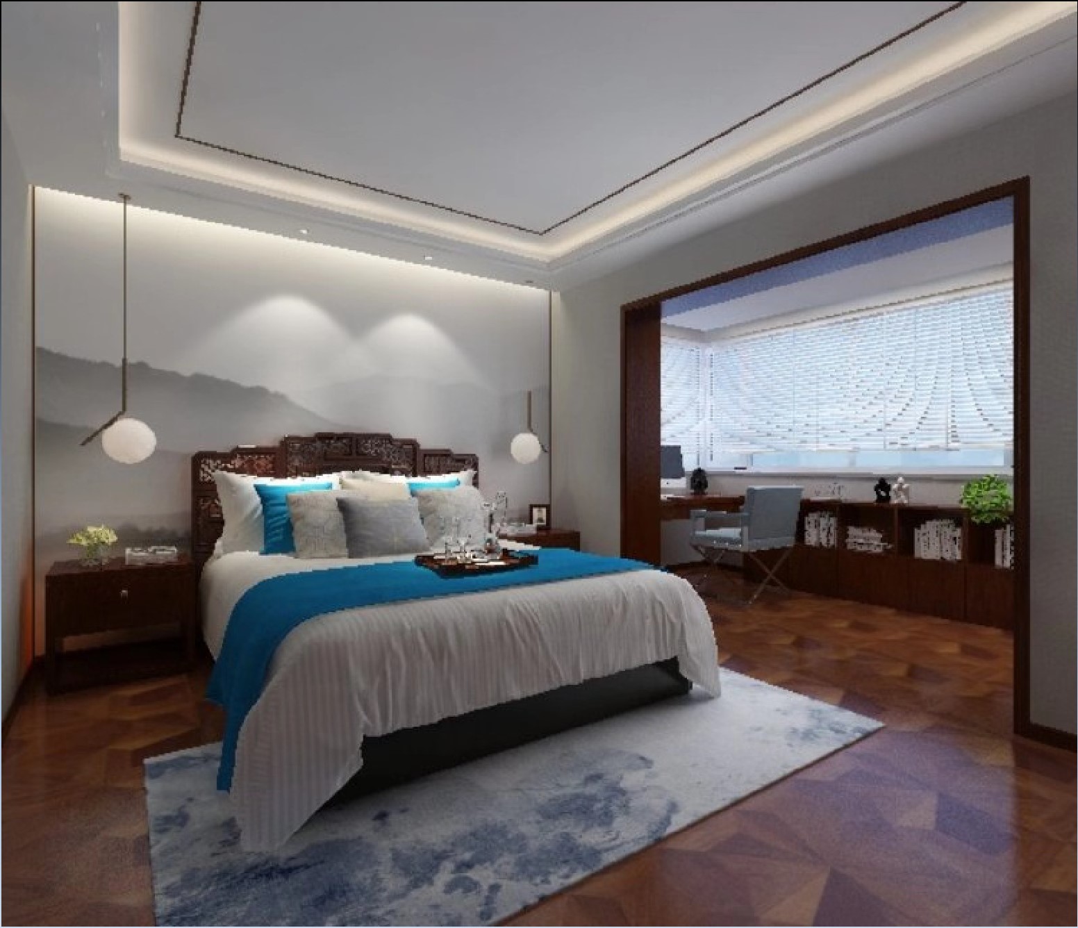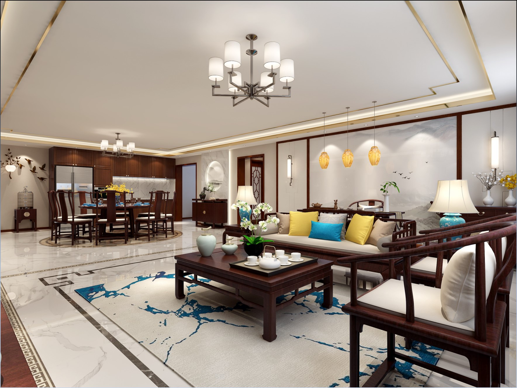 忧郁的蓝,素雅的米、沉稳的棕与散发迷人魅力的装饰线条提升了客厅气质,使空间更加有层次感,搭配山水壁布,使餐厅空间更有书香之气,形成其特有的空间气质。
