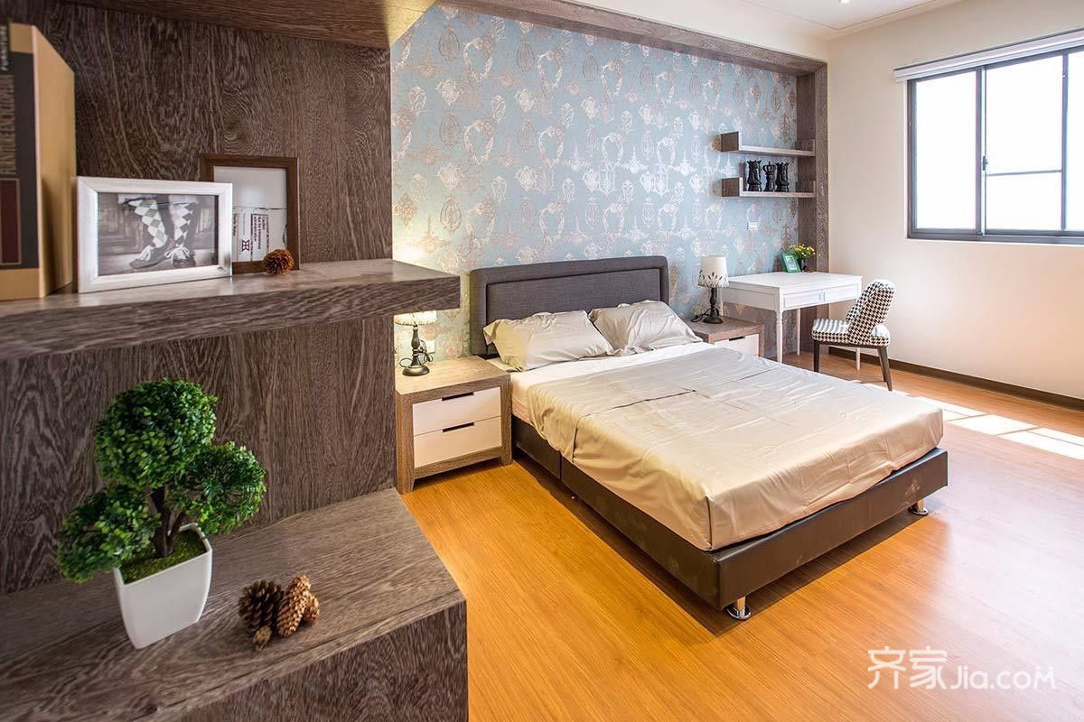卧室区域柜体全部定制,床头背景选用墙纸饰面