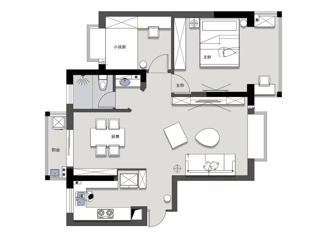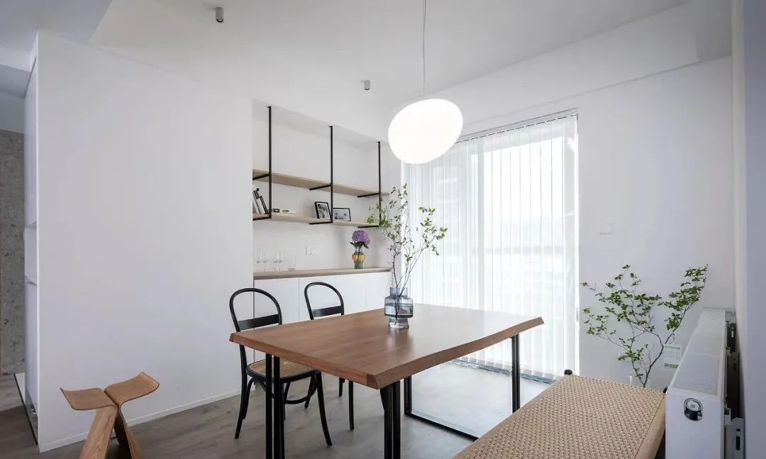 干区门洞斜向处理,增大过道空间,拱门元素的使用带来趣味性。顺应位居动线中心的长型餐区,摆放长形方桌,连结了公共区域互动