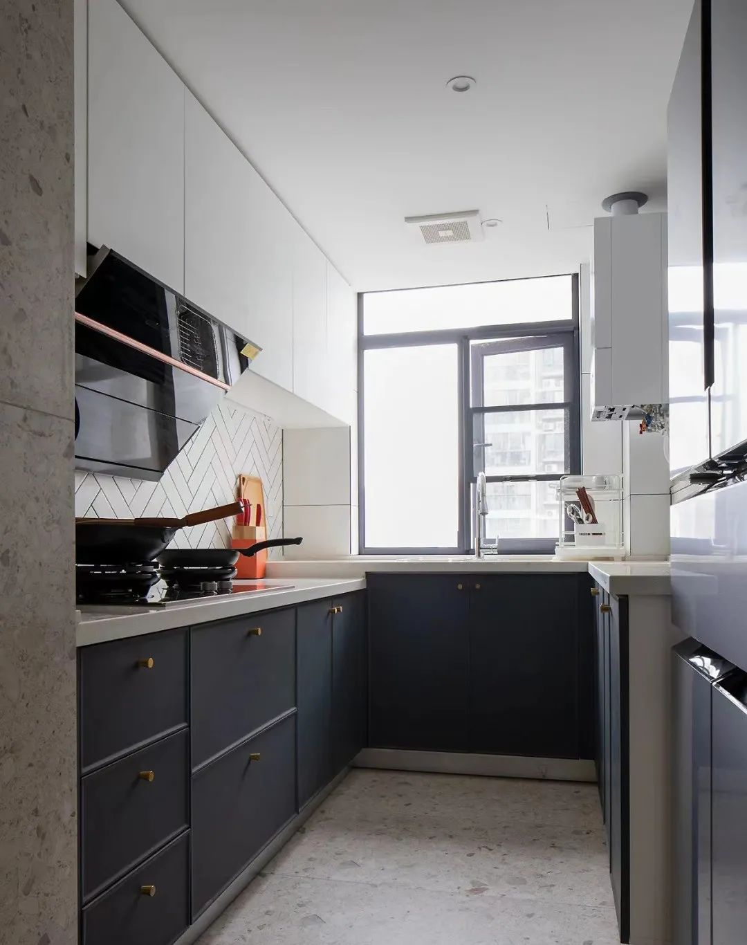 厨房地面水磨石瓷砖和玄关处瓷砖同款系列,细节上进行了呼应。吊柜用的白色柜门,墙面靠灶台这面小砖人字铺,显得更有层次。