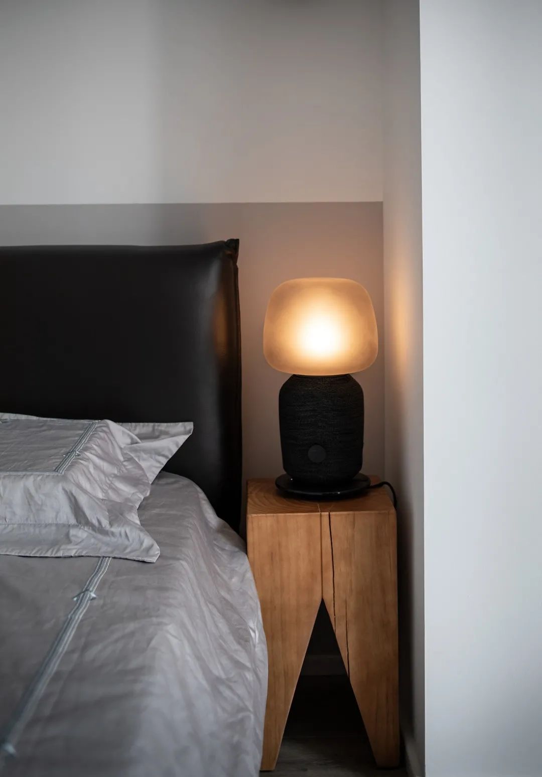 主卧,无主灯设计让空间更显简洁,床头背景做了乳胶漆分色,增加空间层次。将阳台面积纳入卧室,延展了视觉空间。