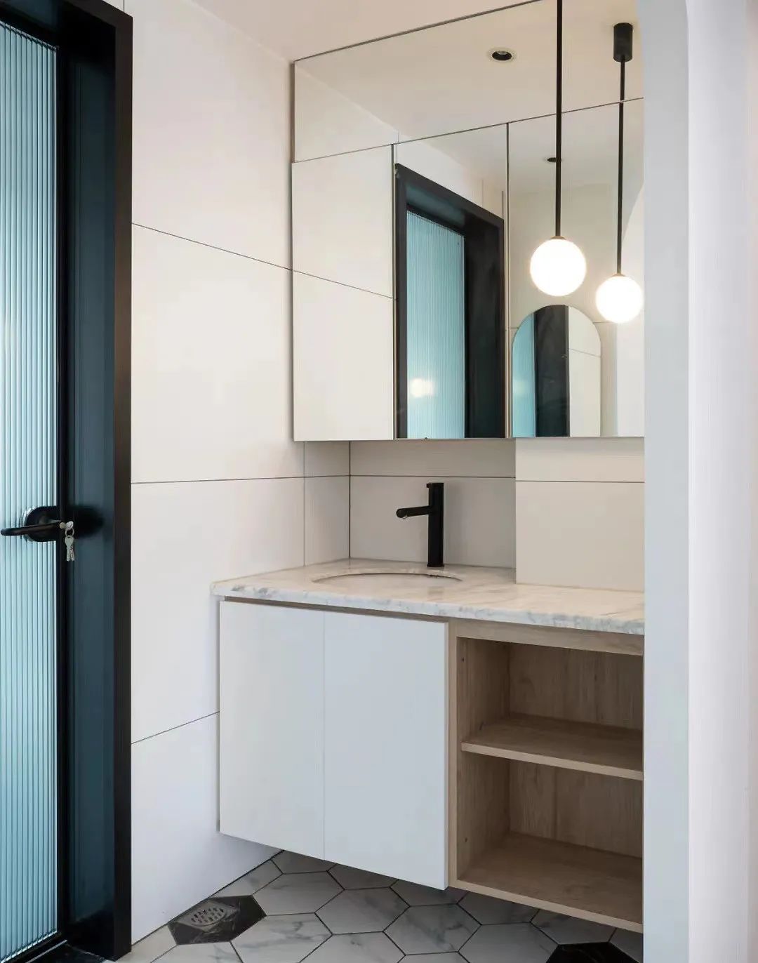 镜柜增加干区储物,镜柜对面还装了一个全身镜,利用好每一处的空间。