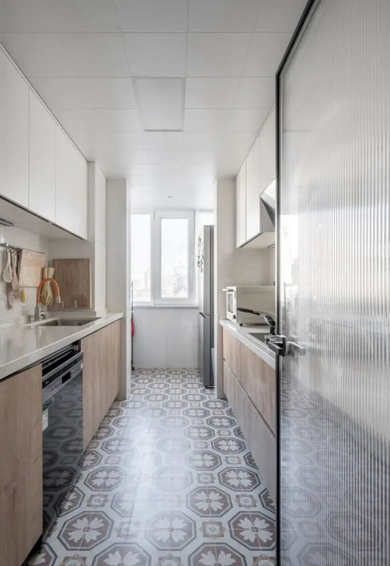 来到厨房,考虑到外面有一个小阳台,以及为了充分引入采光,橱柜就采用了面对面的方式布局。