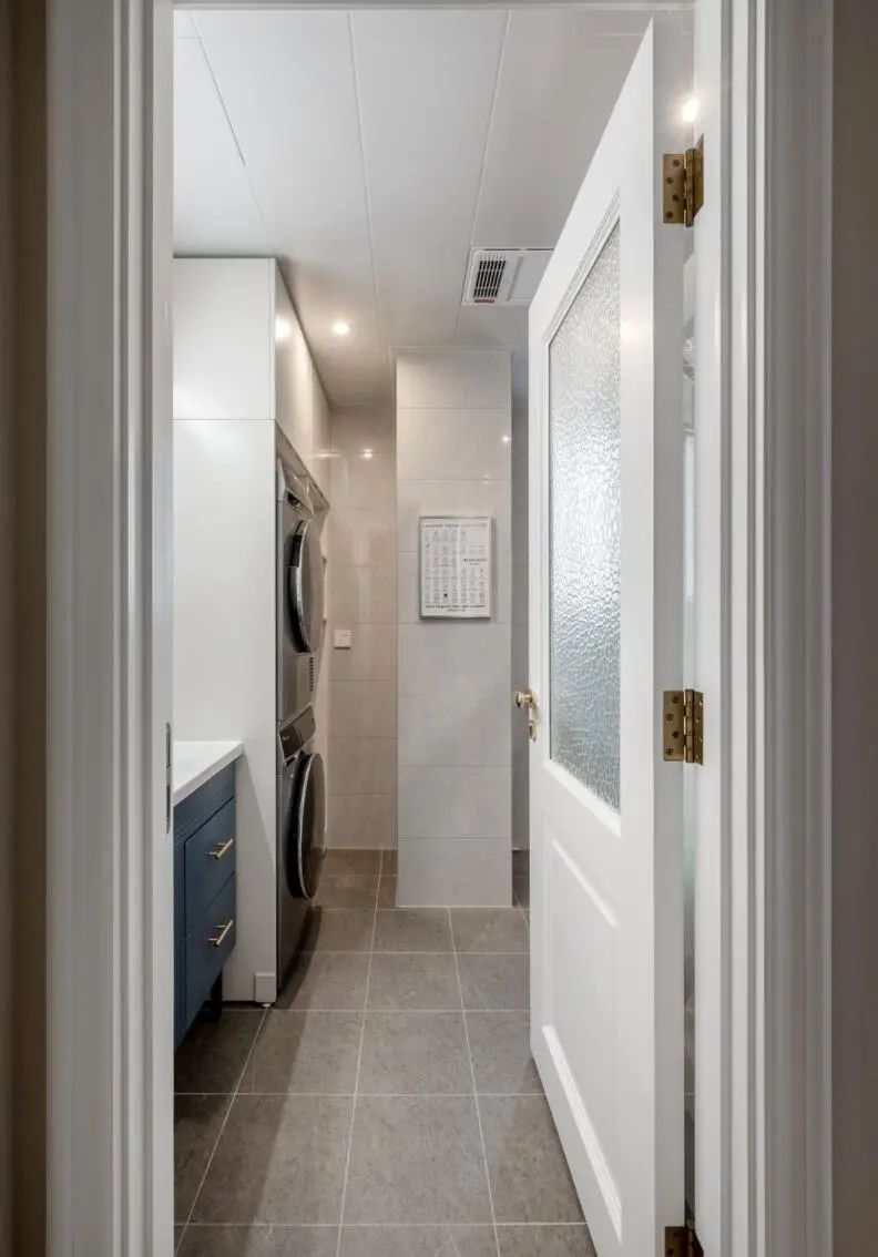 全屋唯一改动的区域就是卫生间了,整体向主卧扩大之后,既让内部实现了独立淋浴间配置,也解决了洗衣机、烘干机的空间需求。