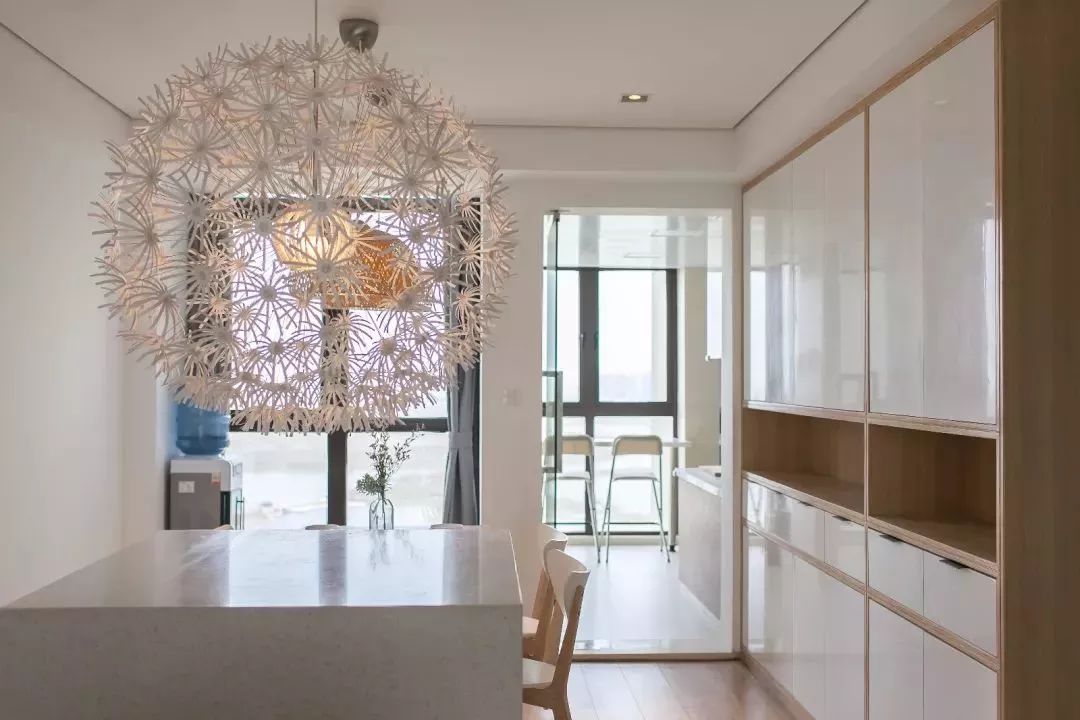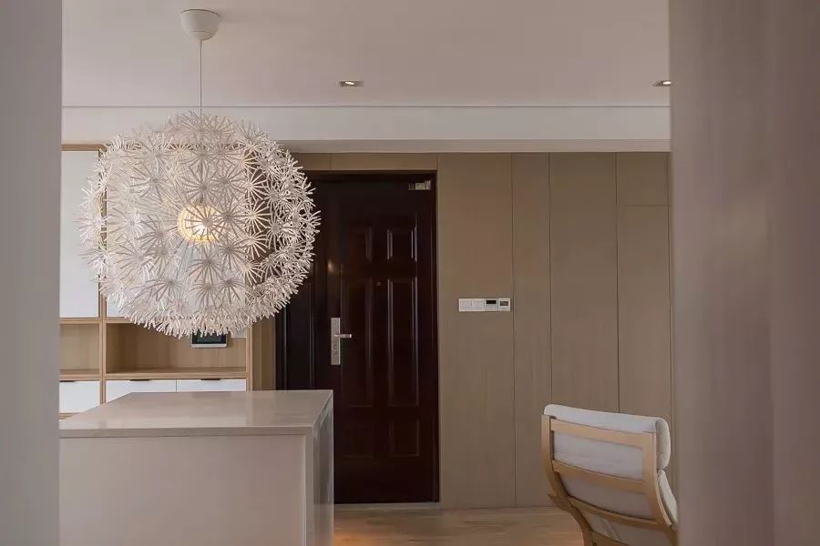 入户右手边,布置原木+白色拼接鞋柜,透过餐厅的球形灯,一进门就能感受到温情优雅的居家氛围。