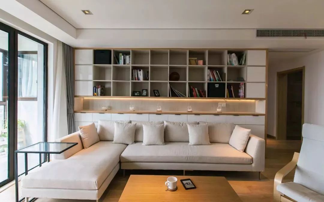 客厅沙发墙,装了一排储物柜,上面的开放展示架,收纳书籍与装饰品,地柜上方是一排留空的隔层,内嵌灯带,温馨而又有层次感。