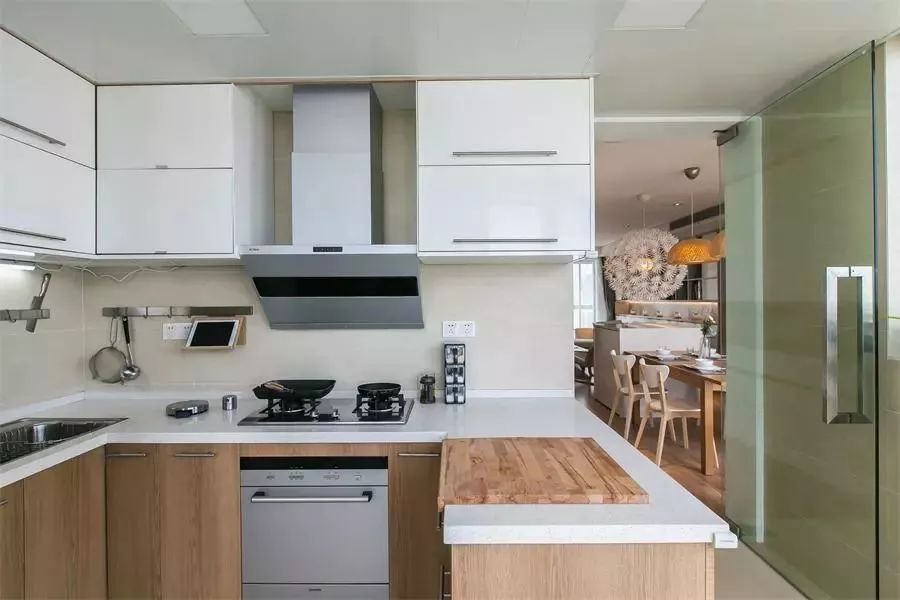 虽然厨房比较宽敞,但也是根据户型面积,设计成U型的厨房操作台,靠近门口这个位置,也可以站人,整个厨房可以容纳多位家人同时操作,非常实用。