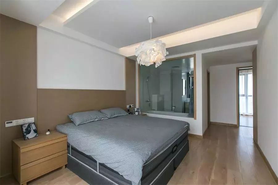 木质床头背板,搭配灰色的软质高床,简单而舒适。主卧吊顶留空,嵌入灯带,光线柔和温馨,很适合放松休息,可以快速进入睡眠状态。