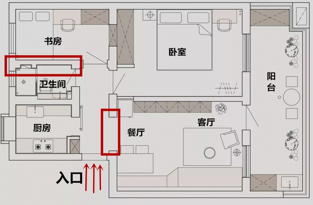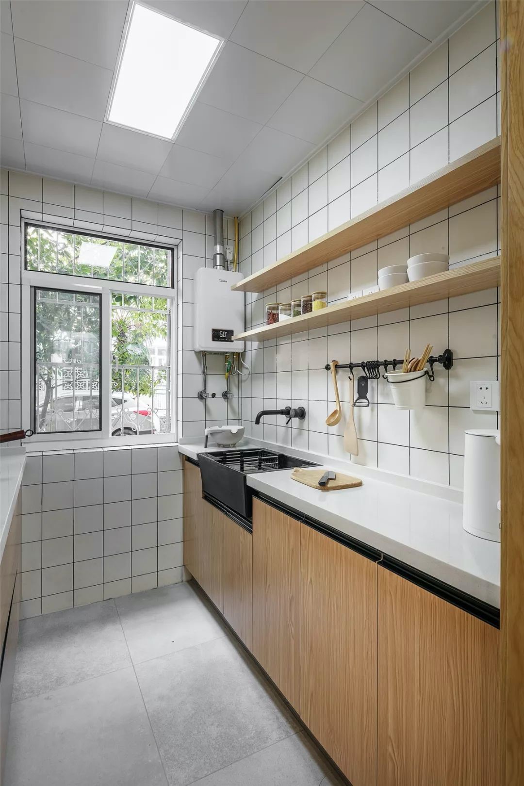 厨房是长条型空间,两侧靠墙分别设计了橱柜+吊柜组合,将油烟机藏进吊柜中,小空间中线条保持一致,干净利落、井然有序