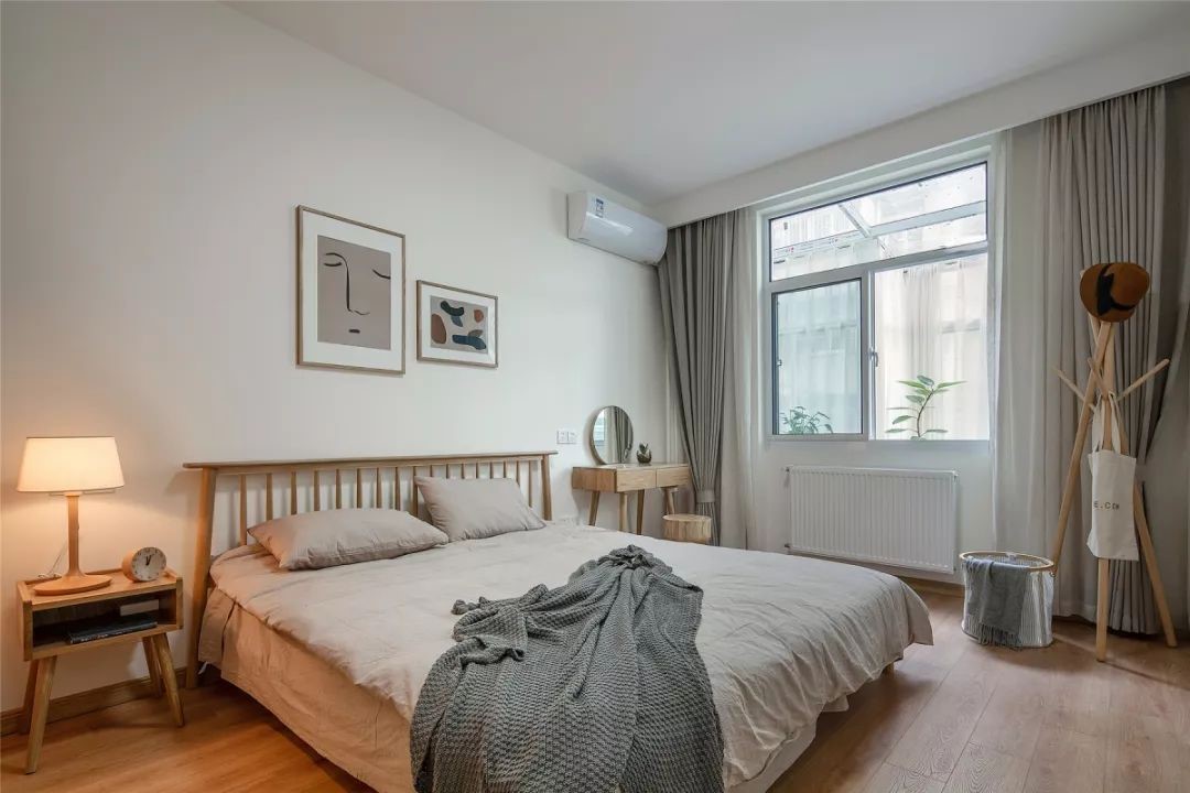 卧室延续整体空间的色调,原木的自然触感+交错有致的白蜡木纹理,打造温馨睡眠环境。