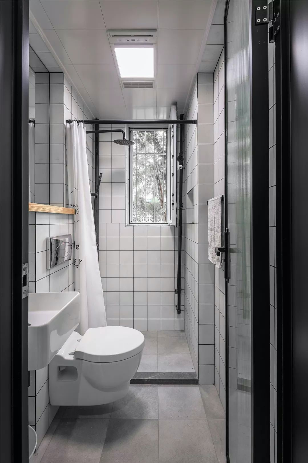 卫生间壁挂马桶设计解决难清理的问题,淋浴区设计在靠窗位置,利用浴帘做干湿分离,壁龛的设计用来放洗浴用品.