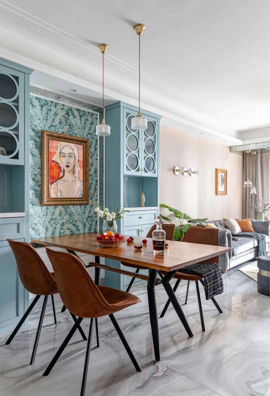 餐厅与客厅连贯,风格上也是采取混搭的设计,让空间被各式各样的艺术元素充斥。
