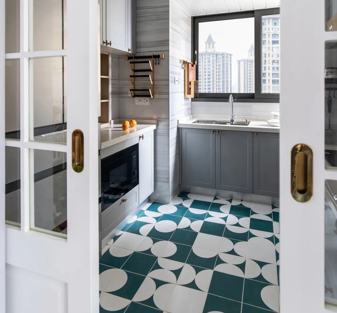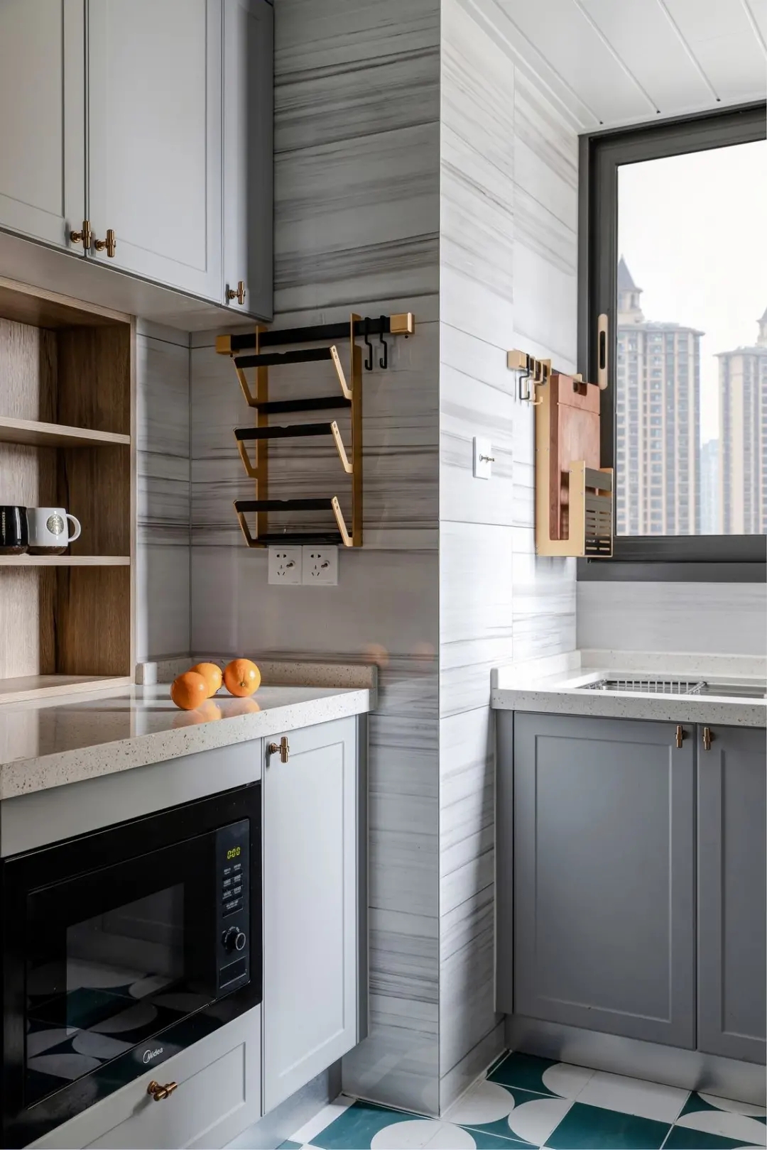 厨房地面是青白拼色的花砖,定制灰色橱柜,在L字形的操作台下,为主人带来了一个明亮文艺的烹饪空间环境。