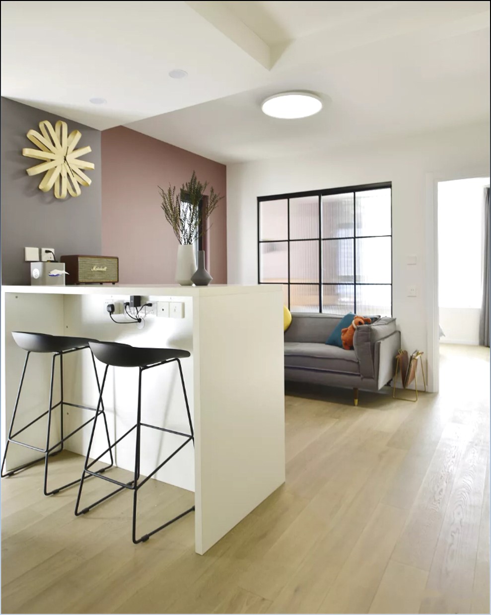 以吧台作为客厅与厨房之间的过度桥梁,一边解决了吃饭问题,另一面作为电视柜,功能上利用最大化。