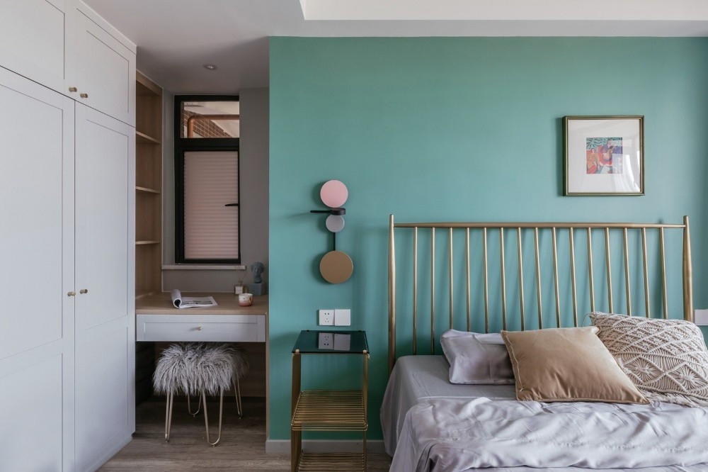主卧宽敞而明亮,除了一整面墙的衣柜设计,还专门为女屋主打造了一个梳妆台。