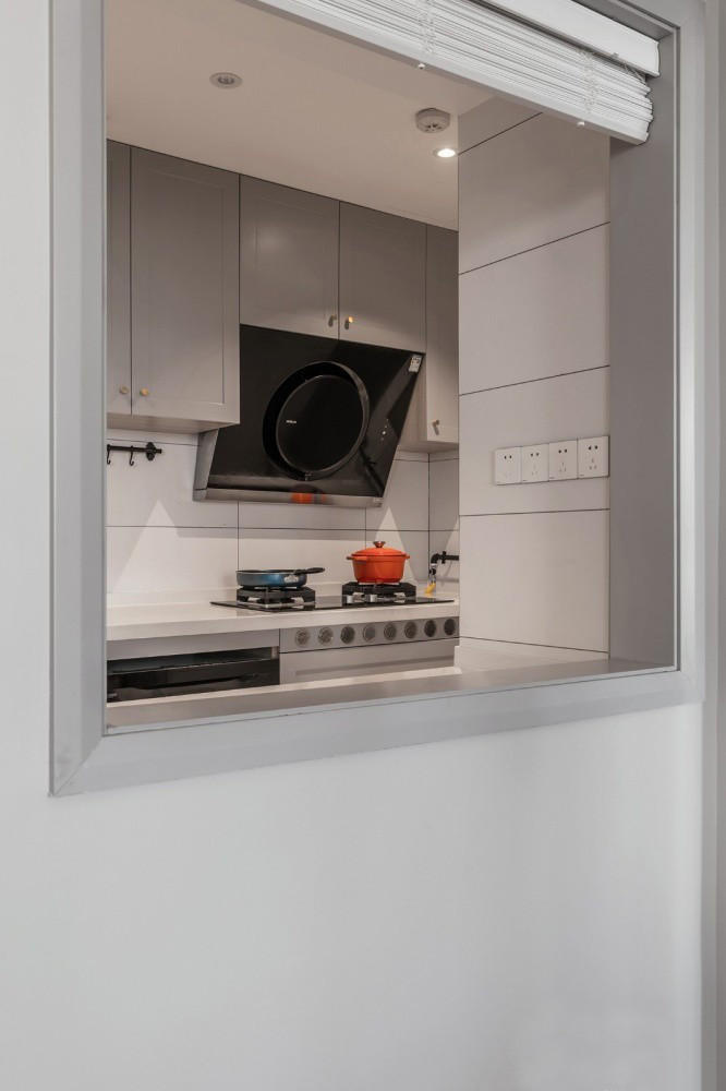 厨房墙面铺设白色瓷砖,灰色橱柜金色拉手,配上地面的小花砖,既精致耐看又方便打理。