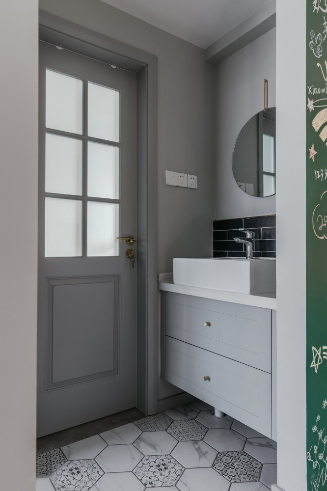 卫生间干区以灰色为主调,墙面局部铺贴黑色瓷砖,防水的同时也让视觉层次更加丰富。