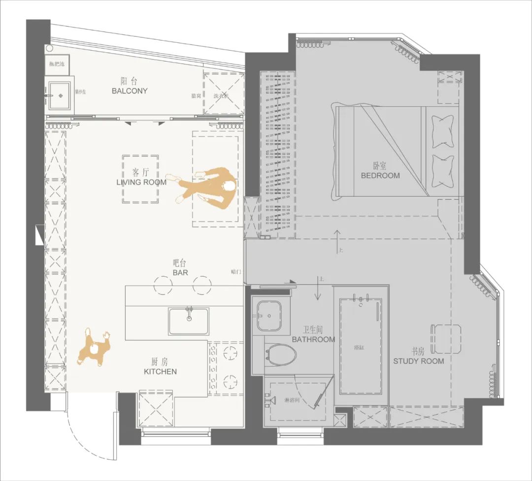 设计对空间进行打破重组,将空间规划为公共区域和私密区。公共区满足交流会客,就餐需求。私密区主要是卫生间,书房,卧室功能。卧室设计为台阶式榻榻米床,与飘窗做一个延伸。台阶式设计提供不同情境式的交流场景和视野,同时增加抽屉收纳。