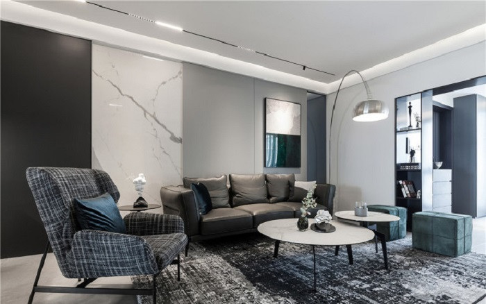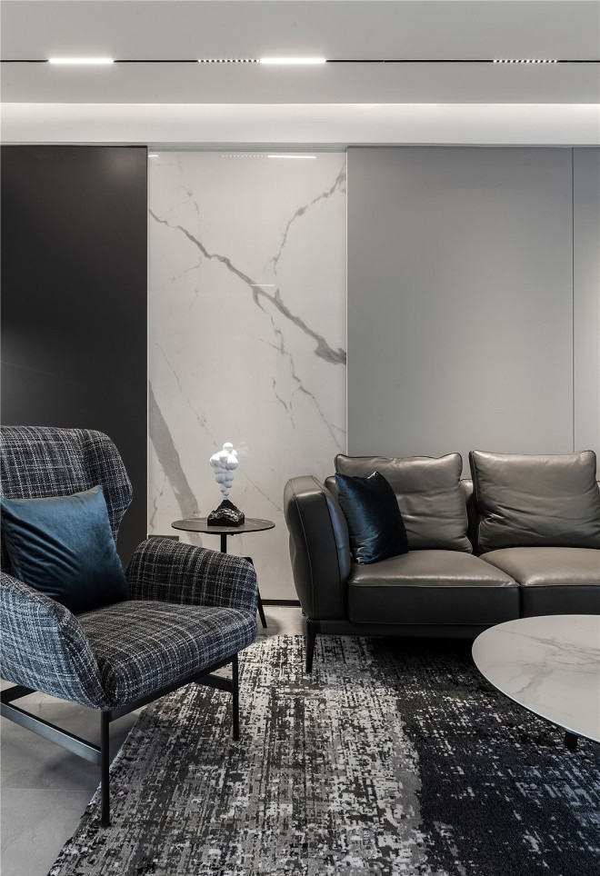 材质颜色上面使用了深灰色的护墙板,中灰的皮沙发还有地毯,黑色岩板的电视柜,角几和单人椅子加上华尔思音响。通过多处岩板过渡,使得整个空间显得非常有层次感和***感。