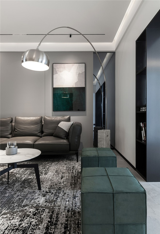 入户右手边也设计了单独的矮柜,衔接黑色不锈钢材质书架,让整个客厅空间有了过渡性。