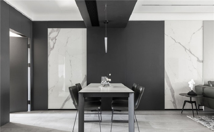 餐厅部分是黑白灰基调, 通过岩板餐桌和墙面岩板的映衬, 还是很配我们的极简风格。