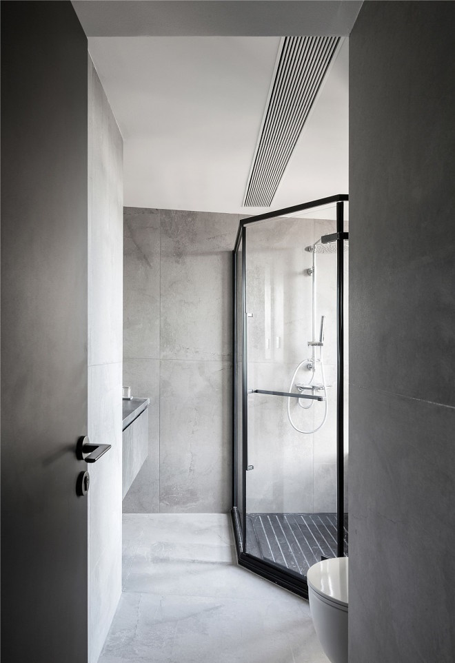 卫生间以灰调墙砖配以白色洁具,还是和客厅一样的基调。设计了无挡水条的处理。淋浴区下沉3公分,加长型地漏。注重整体性,所有包括客餐厅的地砖及卫生间墙地砖,采用了美缝剂。尽量找和砖最接近的颜色。